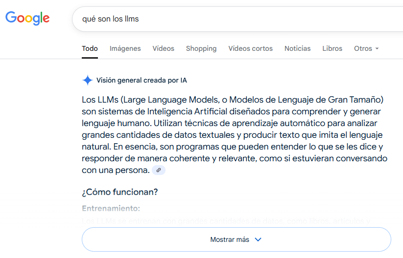 Esto puede ocurrir dentro del entorno de Google o Bing o dentro de las plataformas de grandes modelos de lenguaje (LLMs, por sus siglas en inglés), como ChatGPT o Perplexity. En Google, estas respuestas generadas con IA se conocen como “Visión general creada por IA” (en inglés, AI Overviews) y se ven así: